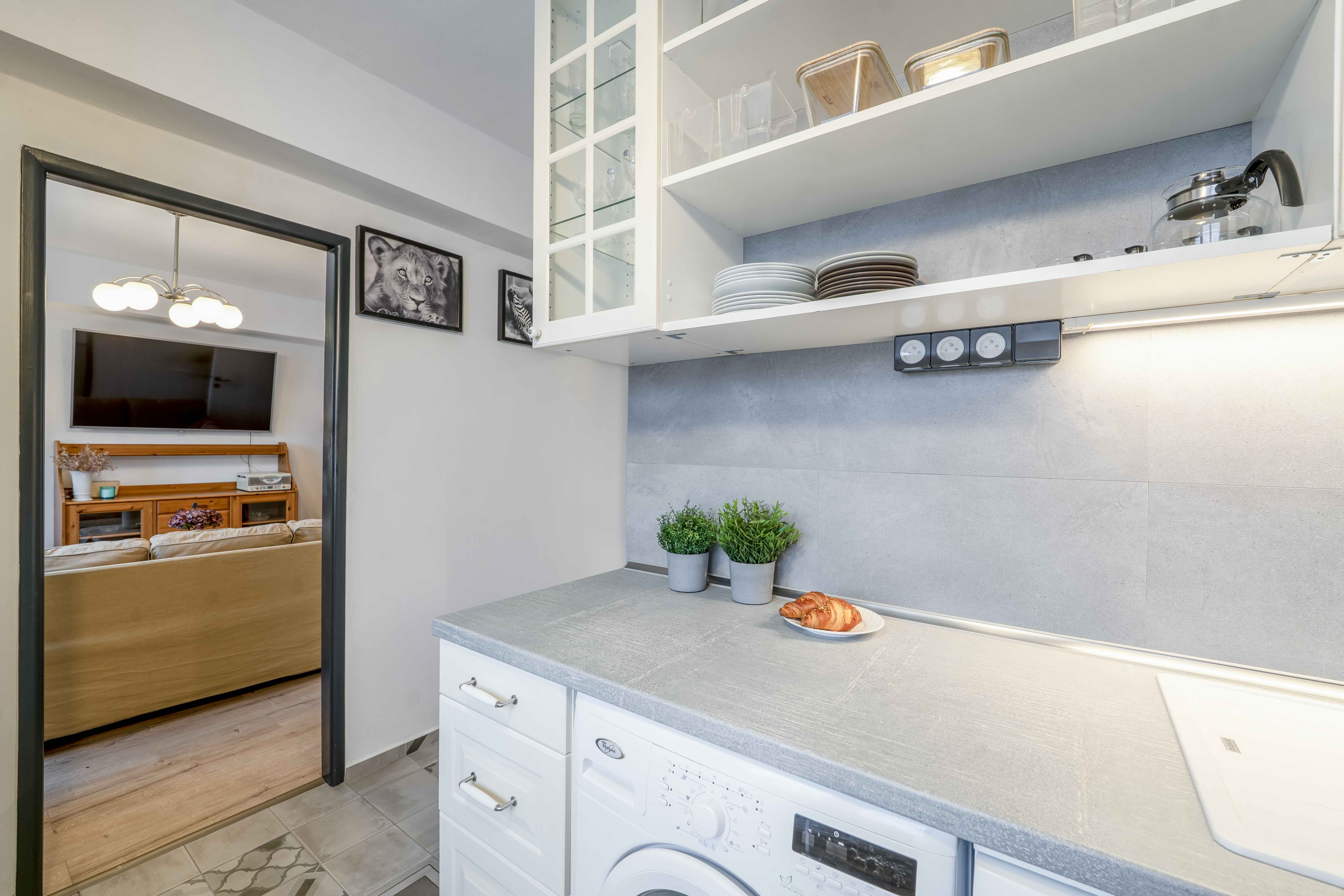 Kuchyně je elegantní, praktická a nabízí dostatek úložného prostoru.